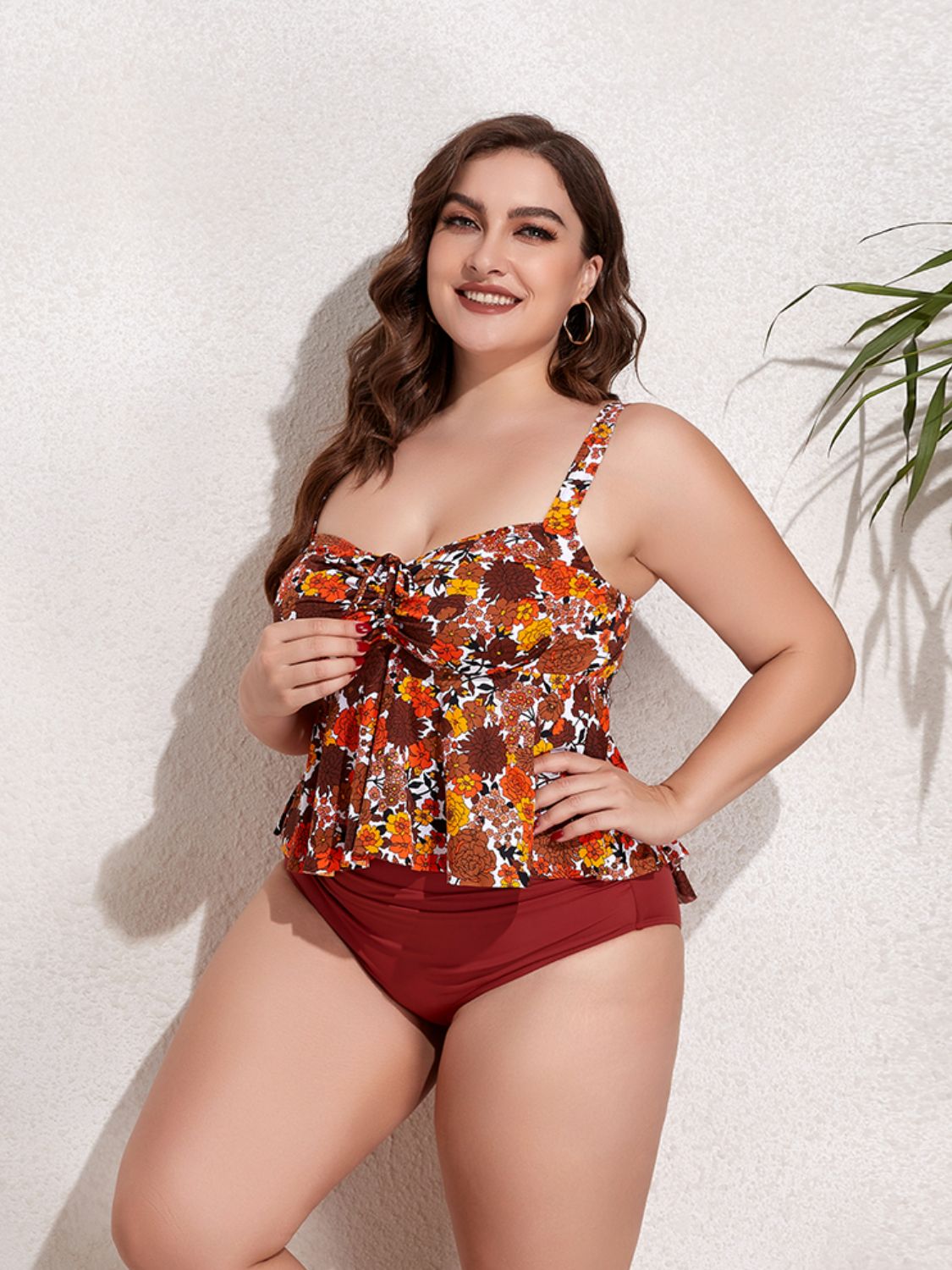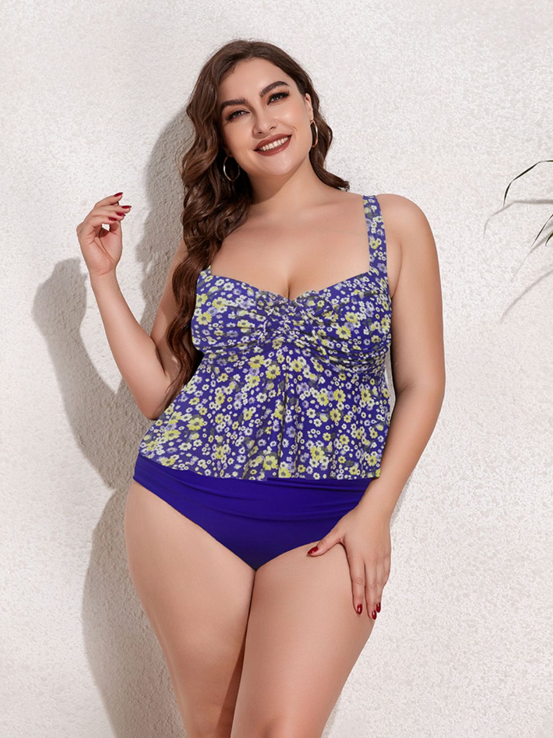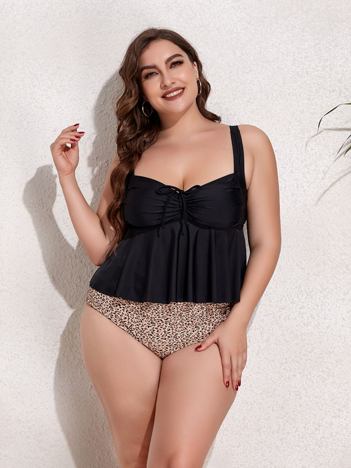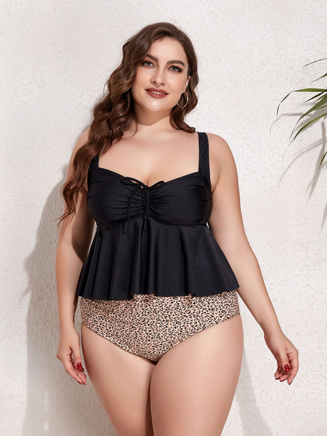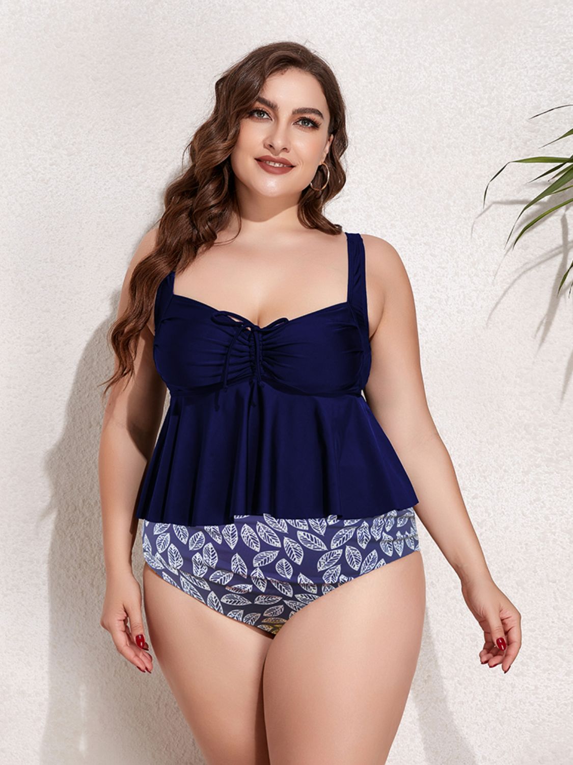Plus Size Two-Tone Drawstring Sleeveless Tankini Set